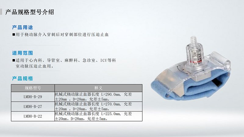 橈動脈止血器主要用于經(jīng)皮介入術(shù)后,對患者的橈動脈穿刺部位進行臨時性壓迫止血